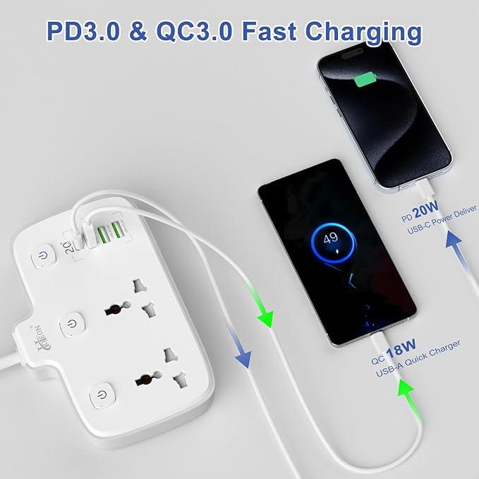 Upgrade your home or office power setup with the Hoteon 3-Pin Extension Board, designed for safety, speed, and convenience. Built to handle everyday appliances and smart devices, this high-performance power strip delivers reliable power distribution with advanced charging features.