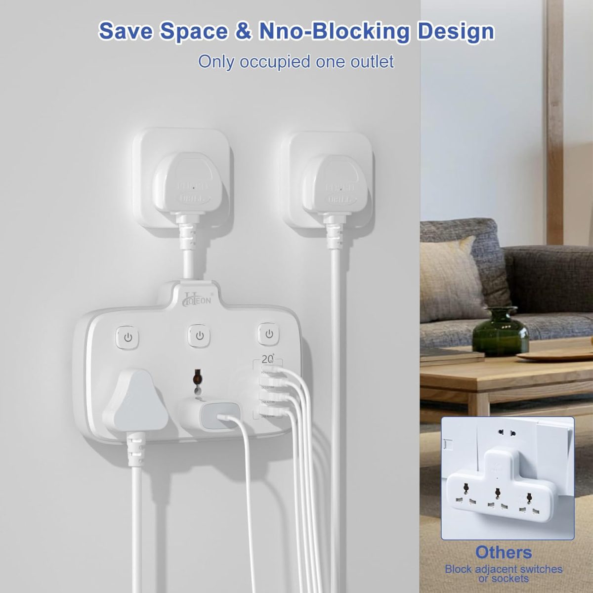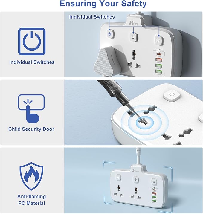 The extension board features 3 individual switches, allowing you to control connected devices separately. This helps save electricity and enhances safety.