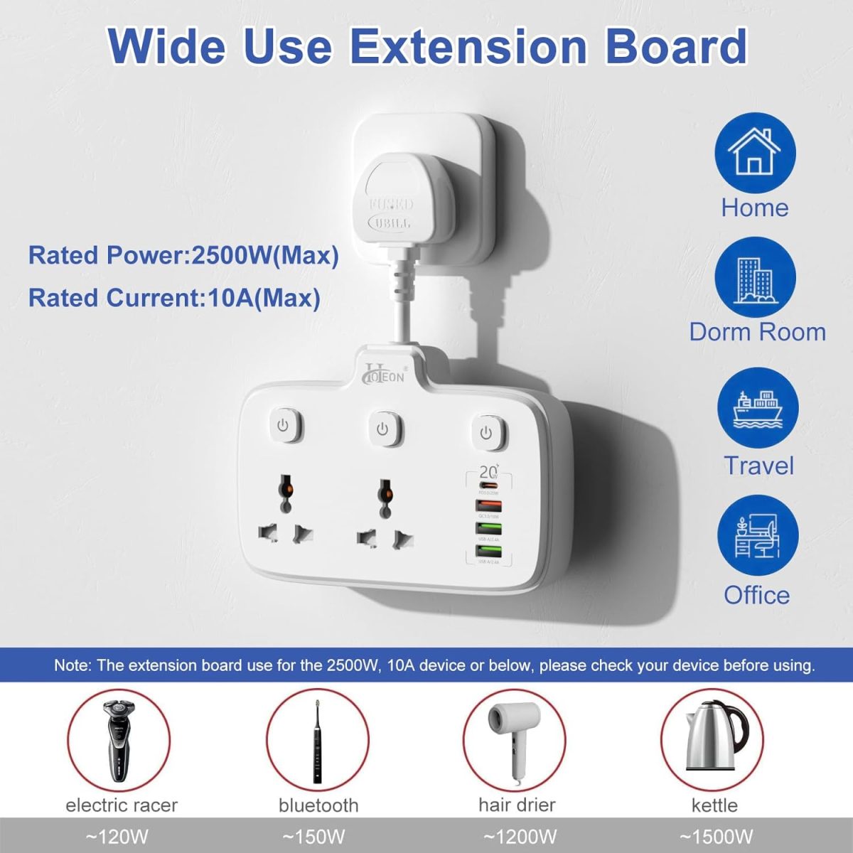 With a 250V capacity and 10A support (up to 2500W), this extension board is ideal for home appliances, laptops, TVs, routers, and other essential electronics. The built-in surge protection safeguards your devices from voltage fluctuations and unexpected power spikes.