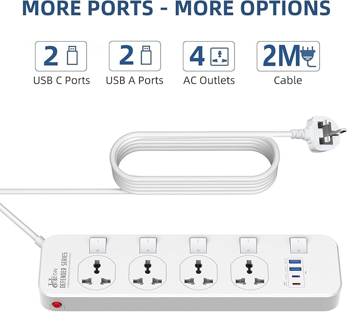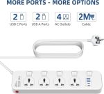 The 2-meter heavy-duty 3-pin cord provides flexibility and convenience, making it ideal for both home and office setups. Its durable white body and compact design ensure long-lasting performance while maintaining a clean and modern look.