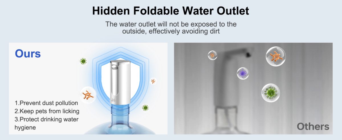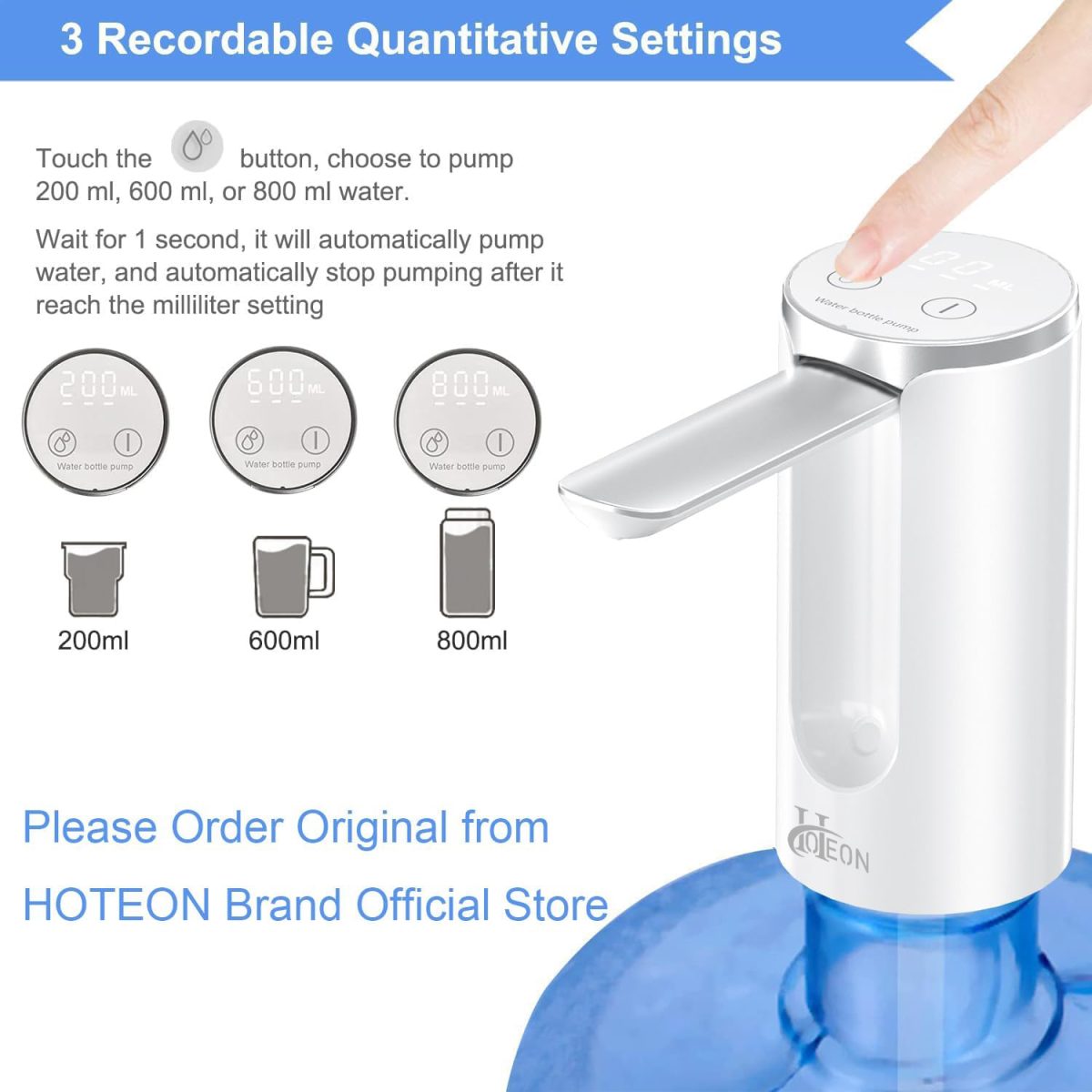 With three preset volume options — 200ml, 600ml, and 800ml, you can easily select the perfect amount of water according to your needs. Whether it’s a quick glass, a medium bottle refill, or a larger serving, this pump delivers accurate and consistent results.