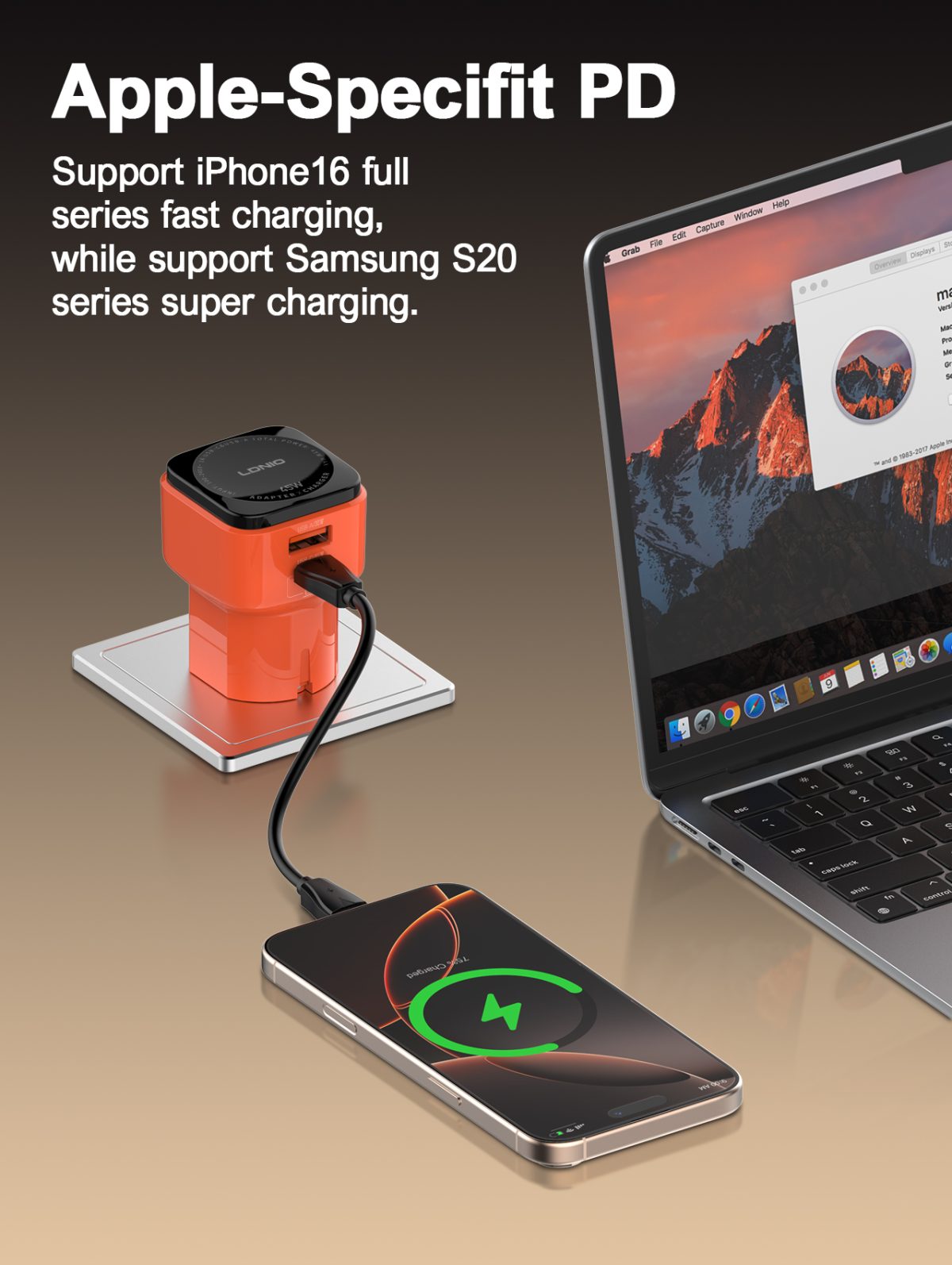 Charge your devices quickly and safely with the LDNIO Q2420 Fast USB Charger. Equipped with USB-C and USB-A ports, it supports Power Delivery (PD) and PPS (Programmable Power Supply) protocols, delivering fast, efficient, and intelligent charging for smartphones, tablets, and other USB-powered devices.