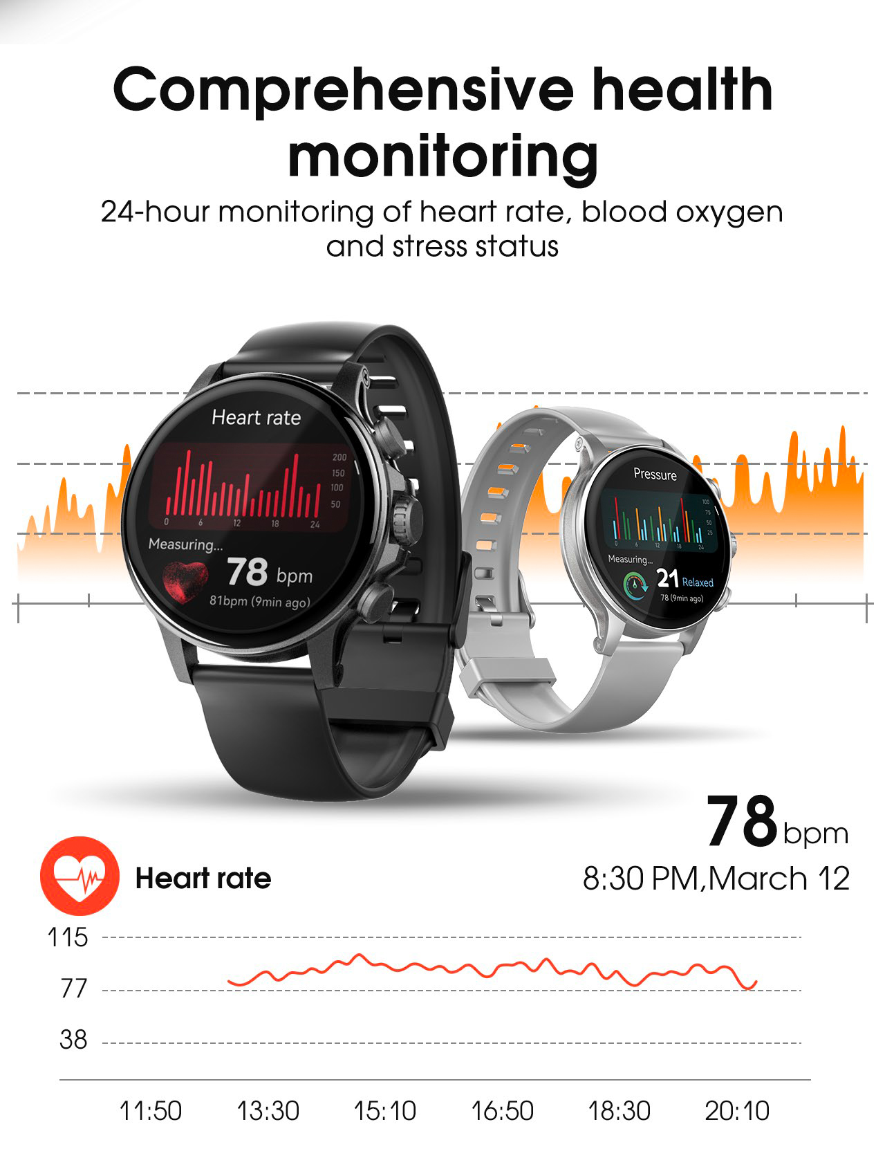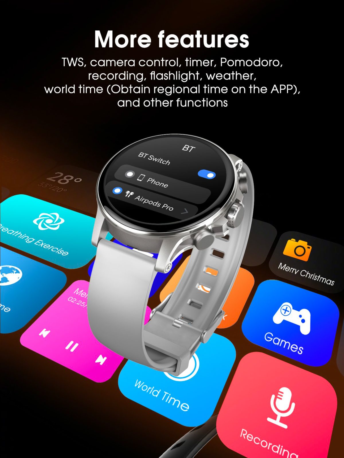 • Health & Fitness Tracking: Heart rate, blood oxygen, sleep monitor, pedometer, and 110+ sport modes with GPS support.