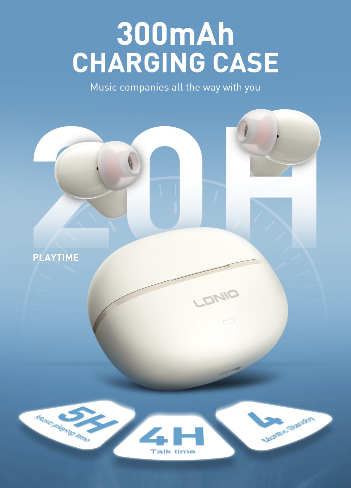 Each earbud houses a 3.7V/30mAh battery, offering approximately 5 hours of music playback and 4 hours of talk time per charge. The compact 300mAh (1.11Wh) charging case supports additional recharges and takes about 1.5 hours to fully charge, while the earbuds themselves also charge in about 1.5 hours. Fully charged, the earbuds can remain on standby for up to 4 months, ensuring they are ready whenever you need them.