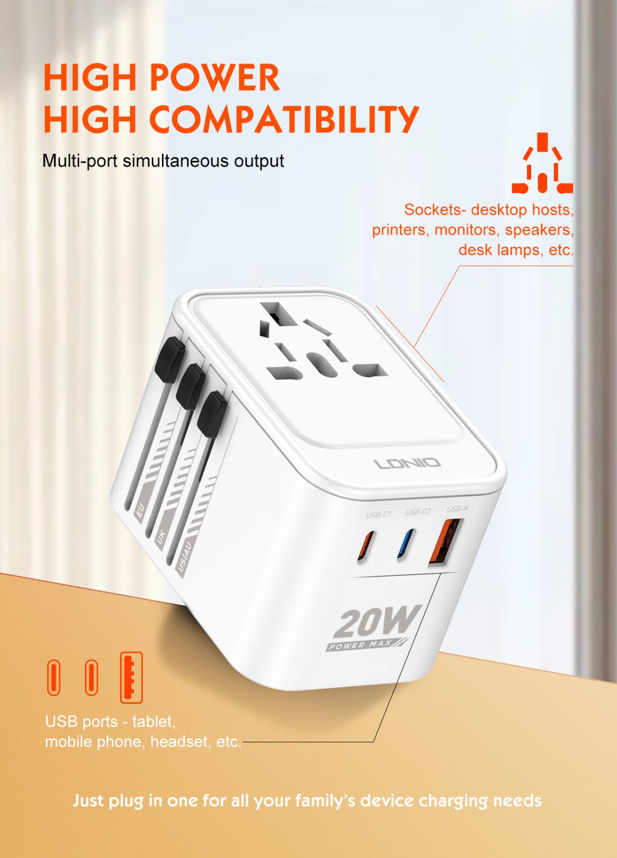 The adapter is equipped with three USB ports, including USB-C and USB-A, allowing you to charge multiple devices at the same time. From smartphones and tablets to earbuds, power banks, and other USB-powered devices — everything can be powered from a single compact unit.