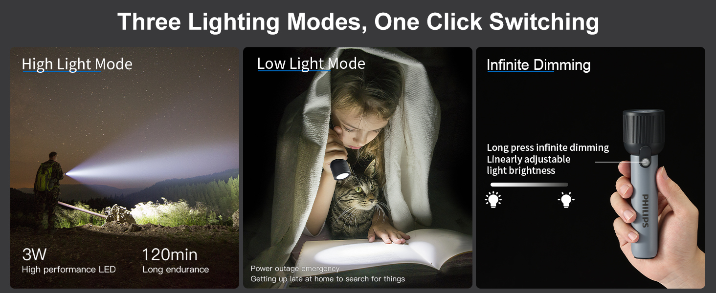 The ergonomic multi-functional switch allows smooth operation with three lighting modes: