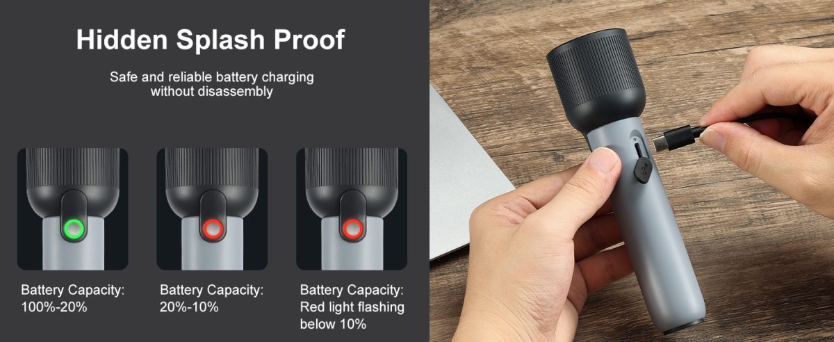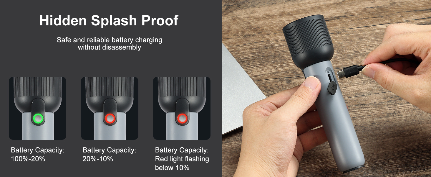 Designed with splash-proof Type-C charging (IP44 rated), this flashlight ensures safe and easy charging. You can recharge the device without removing the battery, making it hassle-free and user-friendly. Smart indicator lights display battery level and charging status, so you always know when it’s ready to go.