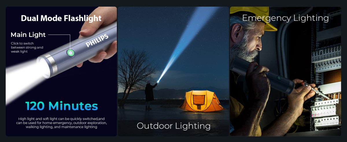 Be the first to review “PHILIPS ABS Multi-Functional Rechargeable Flashlight & Portable Light – 400/350Lumens, 400m/150m Beam Range SFL1188”