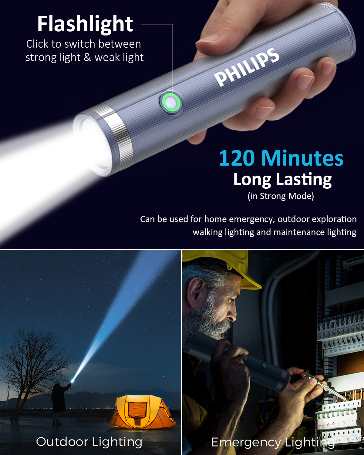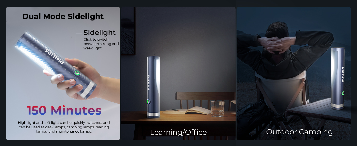 🔄 Dual Lighting Function – Flashlight + Side Light